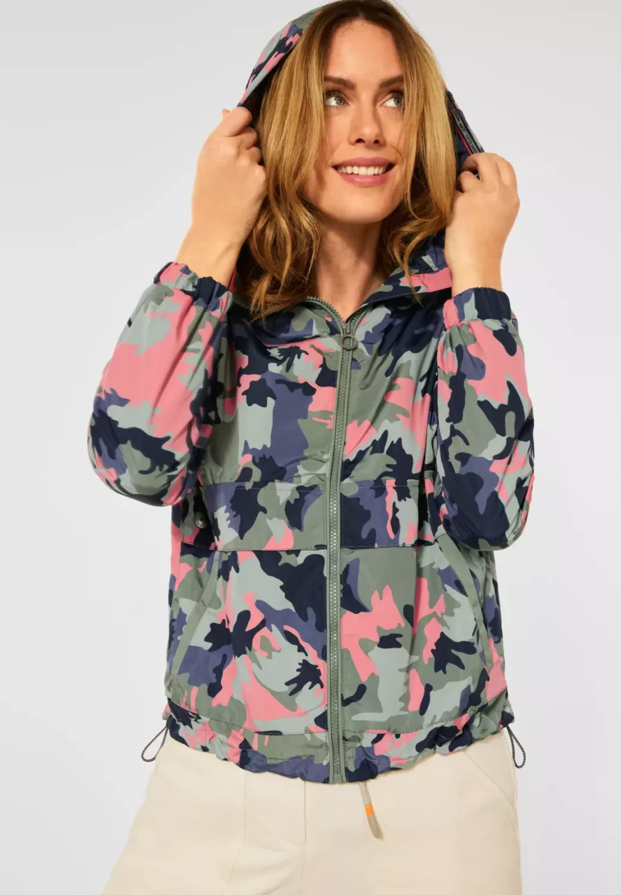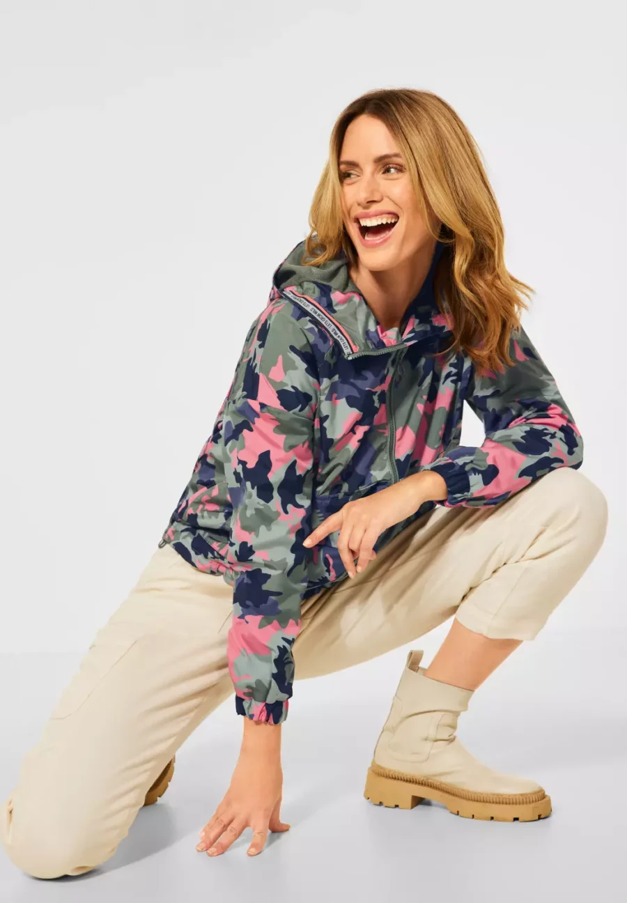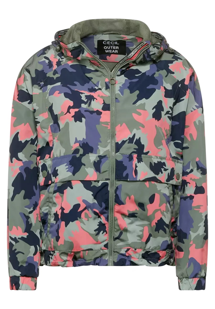 Szélben és időjárásban! Sportos női kültéri kabát a CECIL-től, amely divatos terepmintájával lenyűgöz. A kapucni, a raglán ujjak és a praktikus füles zsebek kiemelik a lezser megjelenést. Az elasztikus mandzsetták kényelmes illeszkedést biztosítanak, és lekerekítik a széldzseki megjelenését.