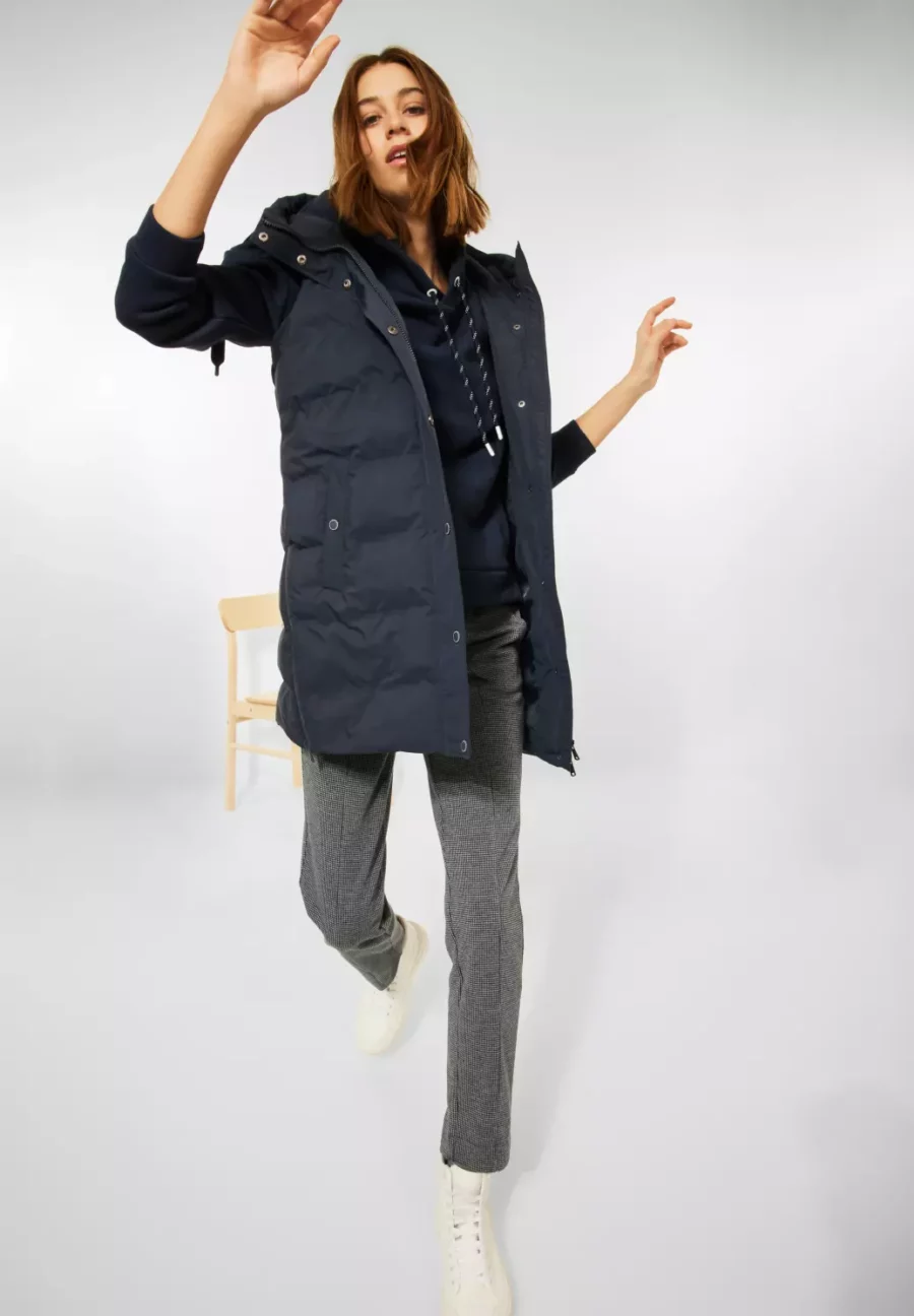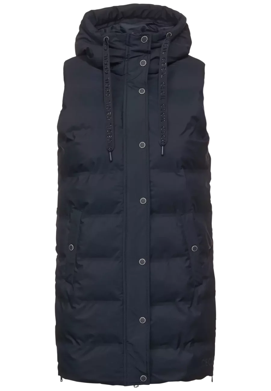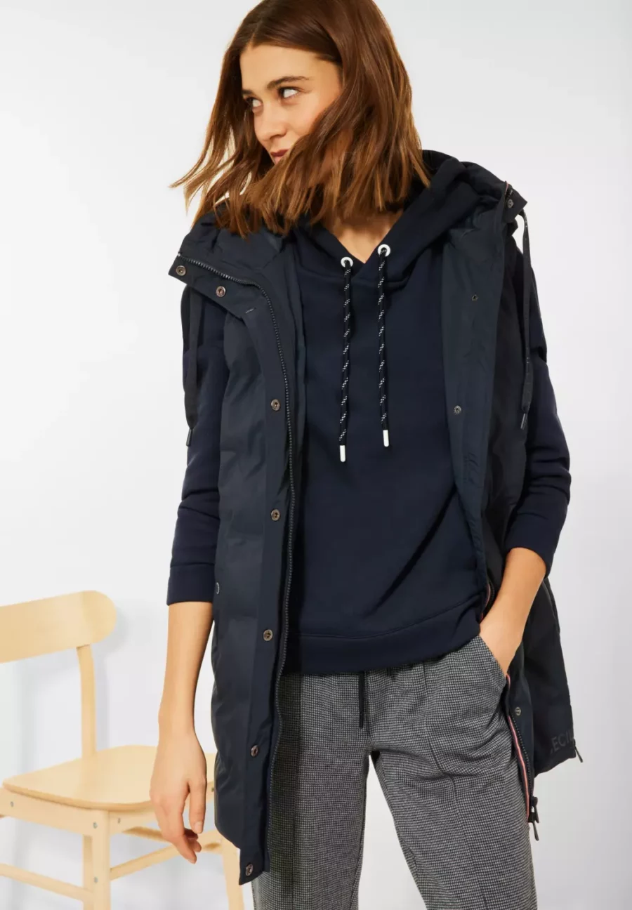 A lépés a sláger! A CECIL sima színű steppelt női mellény hosszú formájának köszönhetően a fenekét is kellemesen melegen tartja. A húzózsinórral ellátott kapucni sportos megjelenést kölcsönöz neki, a praktikus, patentos külső és belső zsebek pedig tökéletes társsá teszik a mindennapokban. A mellény a teljes hosszúságú cipzárral hegesztett varratokkal magasan zárható, az oldalsó cipzárak pedig nagyobb mozgásszabadságot tesznek lehetővé.